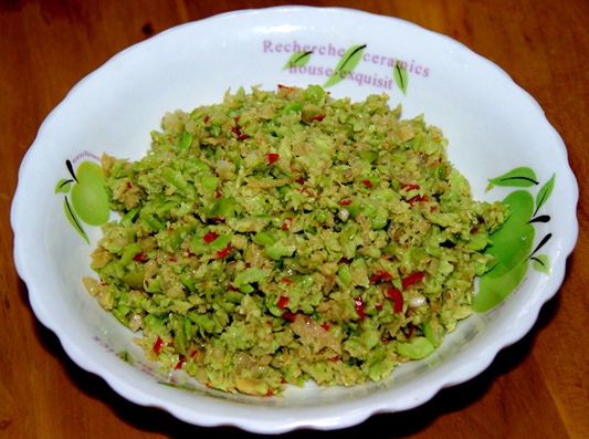 【制作方法】将鲜核桃仁取出,放入适量青、红辣椒、葱、姜、芫荽、食盐倒入石臼捣碎,将制作好的调料与捣碎物拌匀,放置餐盘,油炸部分核桃仁放于餐盘周围即可食用。